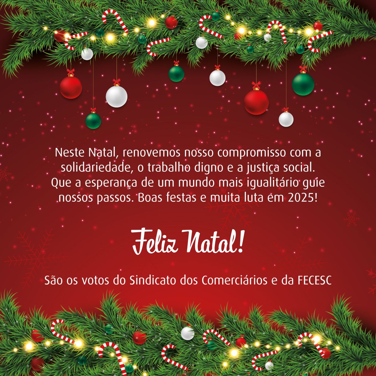 Neste Natal, renovemos nosso compromisso com a solidariedade, o trabalho digno e a justiça social. Que a esperança de um mundo mais igualitário guie nossos passos. Boas festas e muita luta em 2025!
